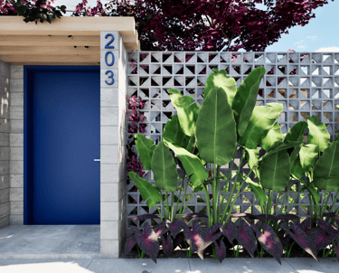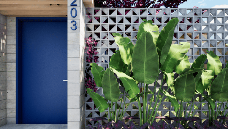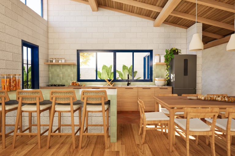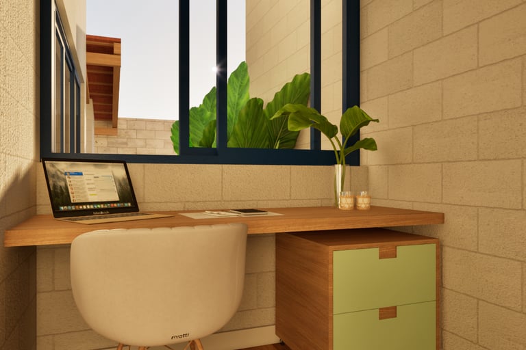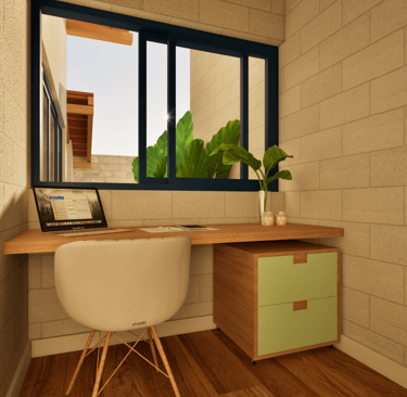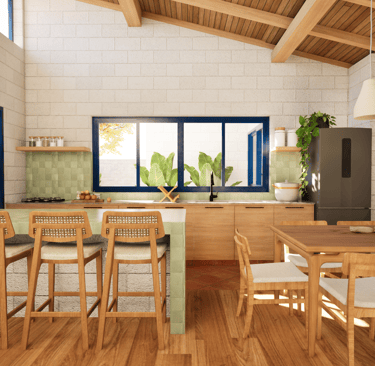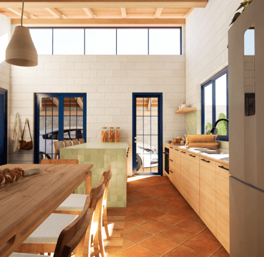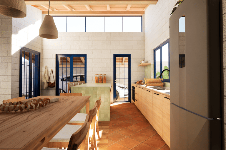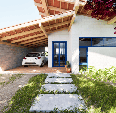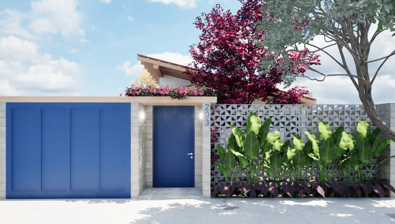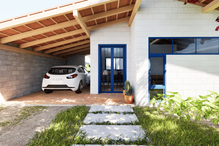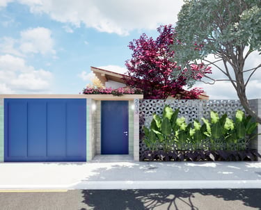 A ideia desse projeto foi ter uma construção sóbria e rústica, para isso, bloco de concreto aparente e pintado foi utilizado, num sistema autoportante. As esquadrias azuis complementam a estética da casa com uma cobertura em shed.